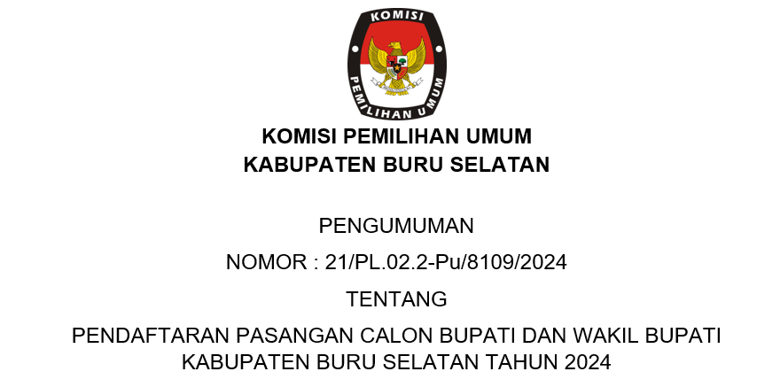 Bahwa untuk melaksanakan ketentuan Pasal 137 Peraturan KPU Nomor 8 Tahun 2024 tentang Pencalonan Gubernur dan Wakil Gubernur, Bupati dan Wakil Bupati, serta Walikota dan Wakil Walikota yang telah diubah dengan Peraturan KPU Nomor 10 Tahun 2024 tentang Perubahan Atas Peraturan KPU Nomor 8 Tahun 2024 tentang Pencalonan Gubernur dan Wakil Gubernur, Bupati dan Wakil Bupati, serta Walikota dan Wakil Walikota, Komisi Pemilihan Umum Kabupaten Buru Selatan mengumumkan Penerimaan Masukan dan Tanggapan Masyarakat terhadap Pasangan Calon Bupati dan Wakil Bupati Kabupaten Buru Selatan sebagai berikut :